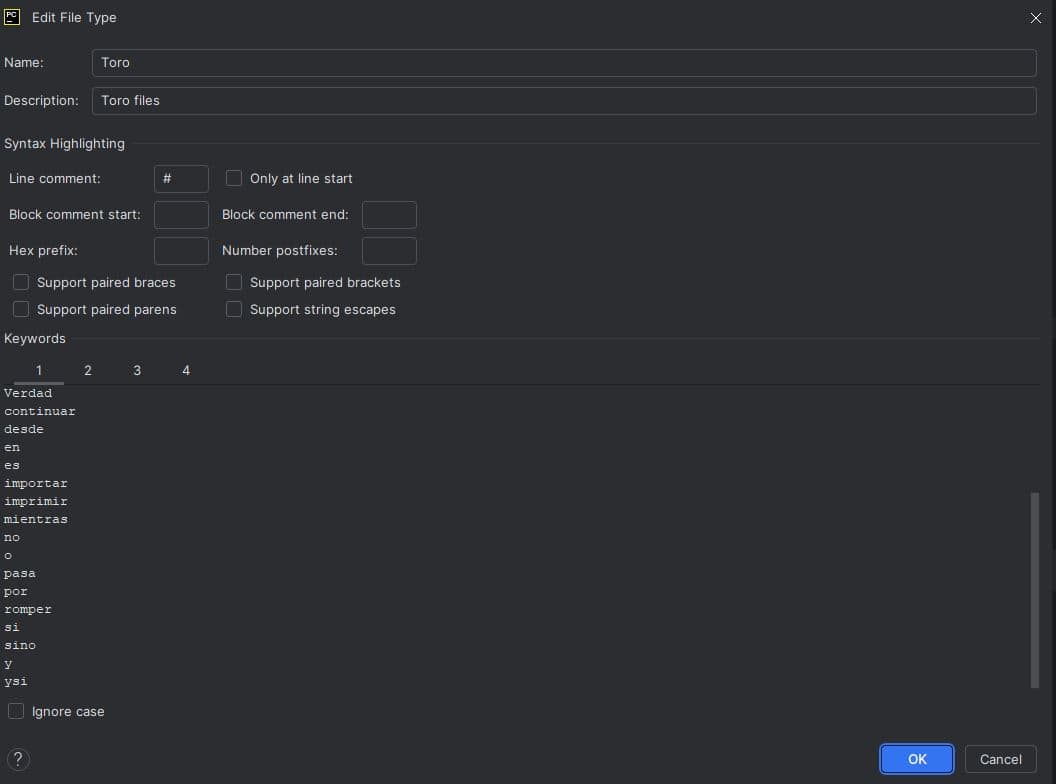 Una vez hecho esto dale a Ok, luego Aceptar y prueba a escribir código en Toro, ahora se resaltarán las palabras como debe ser. Lo único es que si modificas las palabras clave mediante el archivo ttp.json