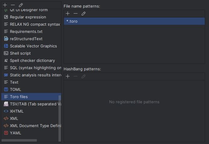 Luego a la derecha, en «File name patterns» agrega una extension de archivo, en este caso *.toro
