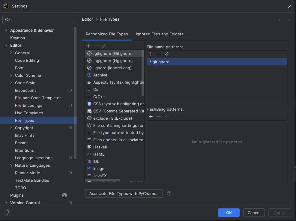 Abre los ajustes de PyCharm y vete a Editor > File types